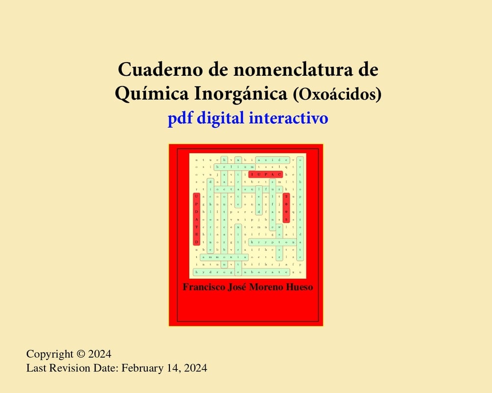 Este archivo pdf (oxoácidos) es un avance al Cuaderno de Nomenclatura de Química Inorgánica (versión pdf interactivo) que publicaré próximamente y destinado al alumnado de 17-18 años (1º y 2º de bachillerato en España y clase 11 y 12 en Estados Unidos). Consta de ejercicios (4 de ocho nombres/fórmulas) para la práctica de la nomenclatura de oxoácidos, así como de un ejercicio tipo test de 20 nombres/fórmulas para la evaluación del aprendizaje. La nomenclatura utilizada está actualizada a las últimas recomendaciones de la IUPAC que son de 2005. Actualmente existen las versiones en español en libro de tapa blanda y en ebook kindle de Cuaderno de nomenclatura de Química Inorgánica y están de venta en Amazon.